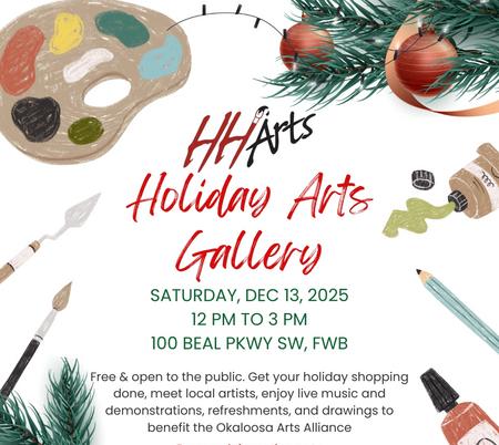 The Okaloosa Arts Alliance (OAA) would like to invite all Okaloosa County artists, art & culture organizations to participate in the fourth annual Holiday Arts Gallery being held on Saturday, December 13, 2025, from Noon to 3 pm. The event is being hosted by HH Arts, which is located at 100 Beal Parkway SW, FWB (near Hwy 98).