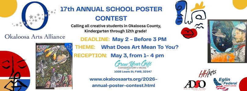 The Okaloosa Arts Alliance (OAA) is calling all young artists across Okaloosa County to pick up their pencils, paints, and creativity for the 17th Annual Okaloosa County School Poster Contest. Open to students from kindergarten through 12th grade, this beloved annual event celebrates the power of the arts and the creativity of our local youth.