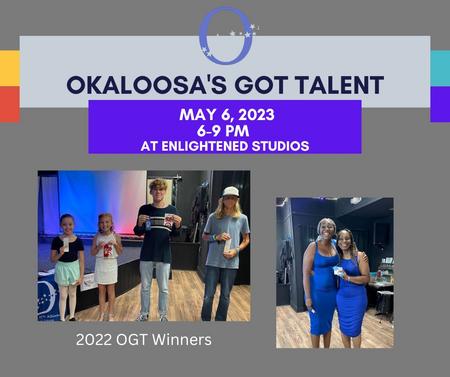 The Okaloosa Arts Alliance (OAA) held the 2023 Okaloosa County’s Got Talent contest (OGT) on Sat, May 6 from 6 pm to 9 pm hosted by Enlightened Studios. Local artists from K-12th grade were in one division and all 18+ artists were in the second division. Talented vocalists, dancers, instrumentalists, and musical theatre performers filled the night with an assortment of live entertainment that was thoroughly enjoyed by all.